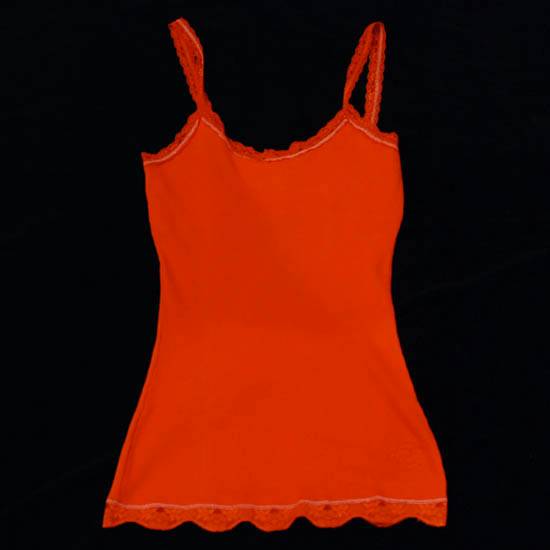 Shown here is a ladies' tank blouse featuring decorative lace trimmings. The vivid red color showcases a sense of uniqueness. This ladies' tank blouse can easily be matched with different styles of outfits.