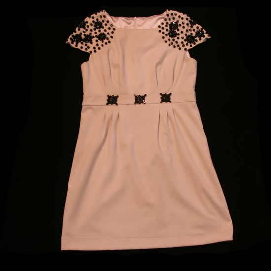 This elegant tank dress features a high neckline with a flattering drape. The dress boasts a pair of cap sleeves and waistband embellished with black glittering beads. T