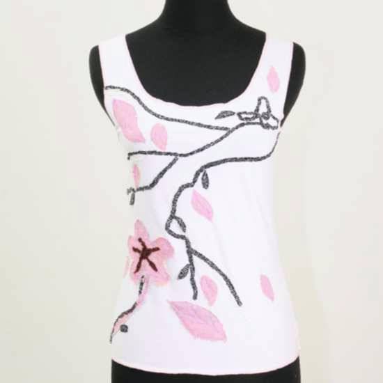 The trendy ladies' tank top flaunts a sleeveless design with a scoop neck and back. The simplified yet exotic image of the Japanese cherry blossom conveys a delicate feminine style. The slim-fit design reveals your alluring body curvatures modestly. This easy-to-match tank top makes an essential item for the summer wardrobe.