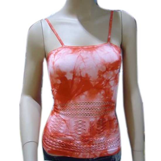 Shown here is a ladies’ tank top coming with a slim cut. The design boasts tie-dyed patterns in sharp orange. Unique stitches are added at waist to highlight a sleek design.