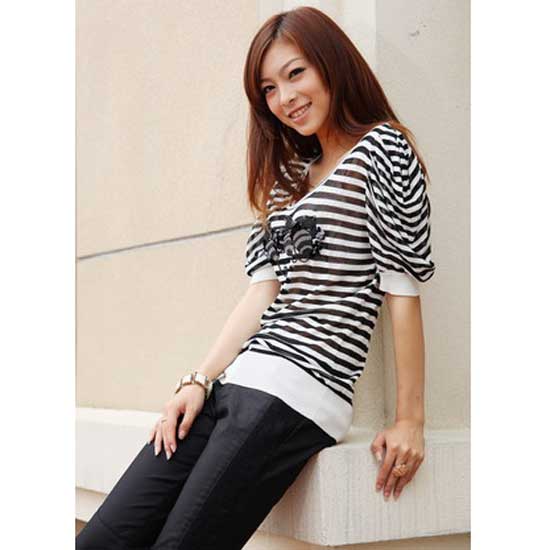 This ladies' top features a striped design in black and white. Coming with a pair of short lantern sleeves, this ladies' top flaunts an elegant style. A bow on the front adds extra charm to this ladies top.