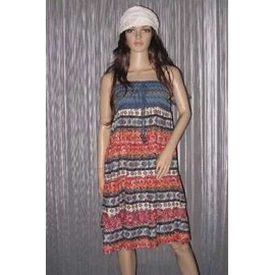 The ladies' tube dress features a loose-cut design for a comfortable fit. The dress is highlighted by stripe patterns in matching blue and red, adding an extra touch of style. This tube dress makes a pretty way to spice up your fashion closet.
