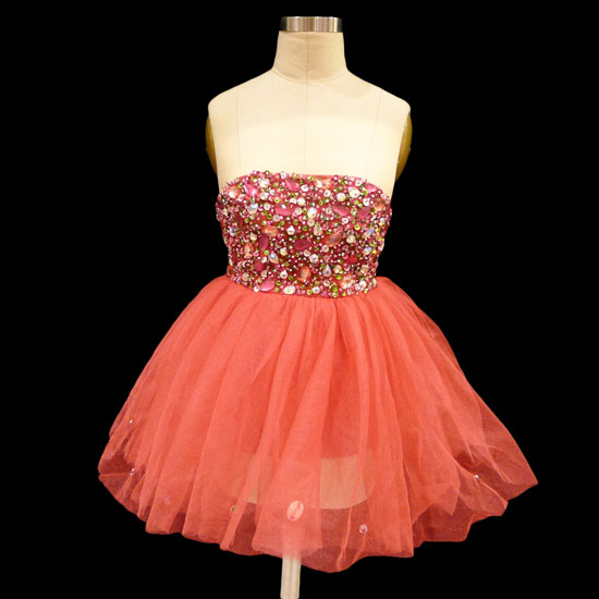 This ladies' tube dress features a red finish. The bodice is decorated with beading to offer a glamorous style. Made of tulle and satin, this ladies' tube dress is comfortable to wear.
