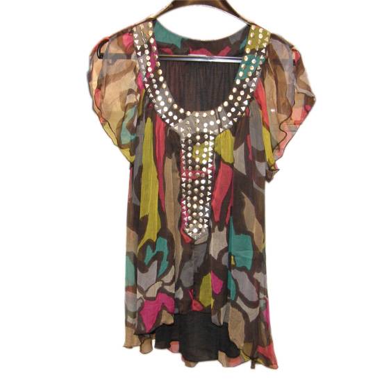 The ladies' tunic comes in earthy colours and has a studded collar.