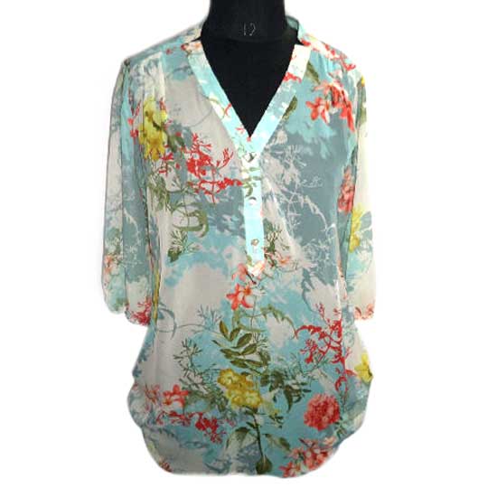 This ladies' tunic is made from sheer polyester fabric accented with colorful floral motifs. It is designed with a V-neck and half-length sleeves. The trendy tunic is perfect to accentuate your summer casual look.