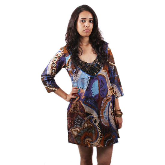Presented here is a ladies' tunic blouse designed with colorful floral patterns. The V-shaped neckline is designed with handwork for an elegant look. This stylized garment adds a rich ethnic touch to your look in summer.