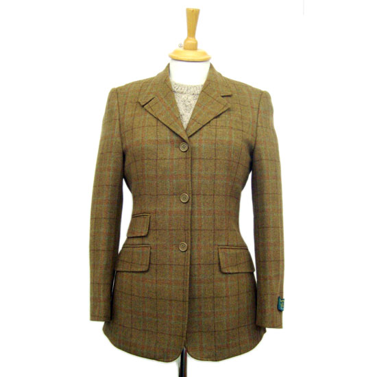 This ladies’ tweed blazer features an olive green exterior in a subtle check pattern. The asymmetrical pocket layout gives the retro jacket a contemporary spin. The fashion label on one cuff lends extra style to the appearance.