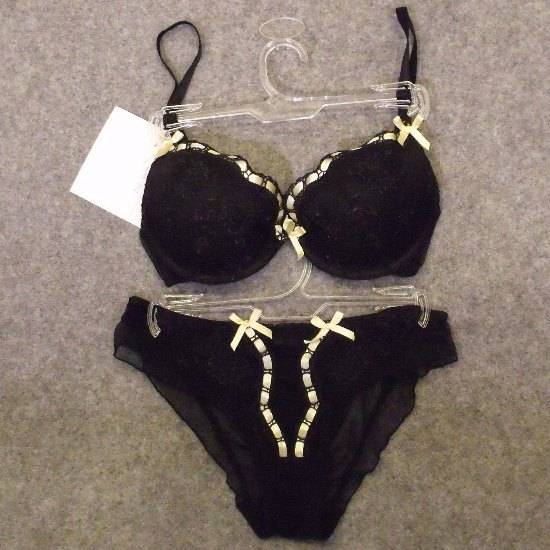 Featured is an underwear set including a brassiere and a pair of panties. The bra boasts a hook closure and adjustable straps. It comes with an underwire styling that provides maximum support for wearing. Both items are nicely finished with decorative knots and yellow stitching.