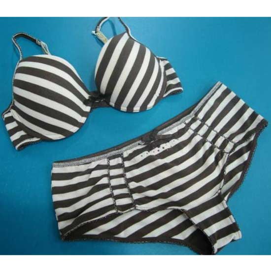 Showcased is a ladies' underwear set with a bra and a pair of panties. The fine black and white stripe patterns add a marine element. This underwear set is made of soft fabric to guarantee a comfy texture.