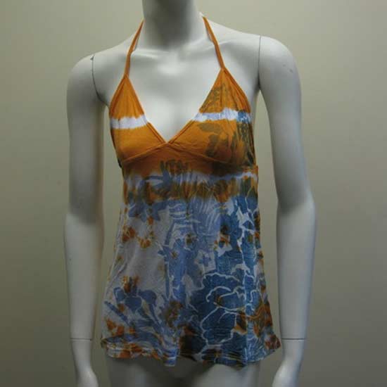 The ladies' vest features a over-neck strap. The floral patterns add a decorative touch. This vest makes an excellent summer outfit item.