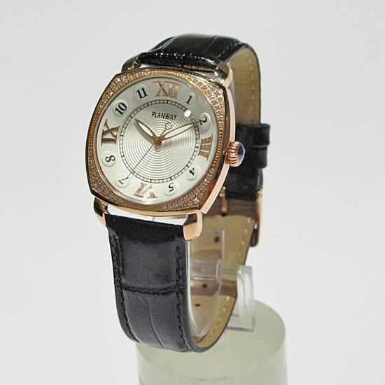 As shown is a ladies watch with a stainless steel casing and a leather strap. The stainless steel feature of this watch contributes to its high durability. This watch is made with Swiss movement.