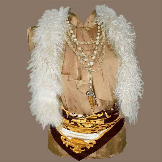 This fascinating ladies top comes with numerous detailed decorations. White feathers adorn the front of the garment and give it a sweet touch. A printed scarf wrapped around the waist looks modern and elegant.