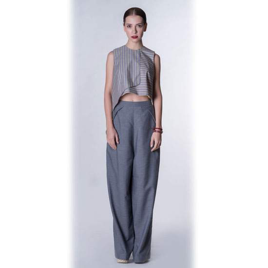 This is a ladies’ wear set that includes a fashionable top and a pair of pants with a matching design. The loose-fit sleeveless crop top comes with double-layer patterns and an asymmetric hemline. These well-cut pants are soft and comfortable to wear.