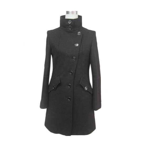 This ladies' woolen coat boasts an elegant and stylish design. It features a stand collar with two buttons, a button closure and two side pockets. The slim-cut design showcases your alluring silhouette very nicely.
