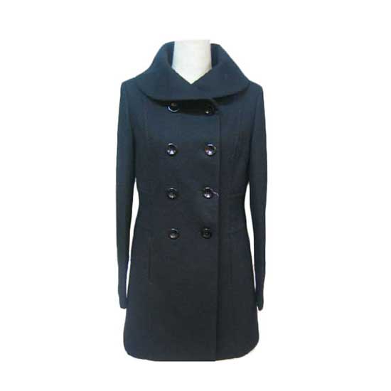 This ladies' woolen coat boasts a classy and timeless design. It features a big collar and a double-breasted front closure with eight matching buttons. This well-crafted coat is made with excellent craftsmanship and attention to detail.