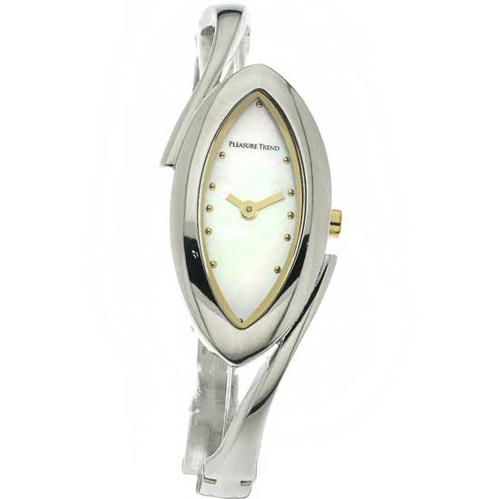 This ladies watch features an oval-shaped, silver-tone case. The timepiece boasts a white dial with dot hour markers and two hands. This fashionable watch makes a lovely addition to your watch box.