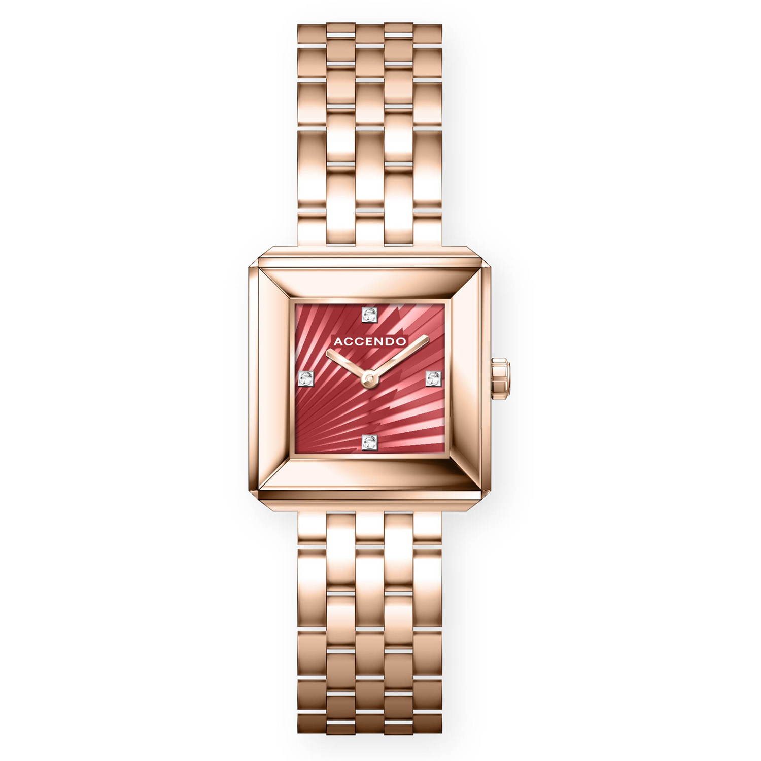 Stainless steel IP rose gold case with 3 ATM water-resistant, stainless steel IP rose gold solid band, red dial with pattern, Japan movement.