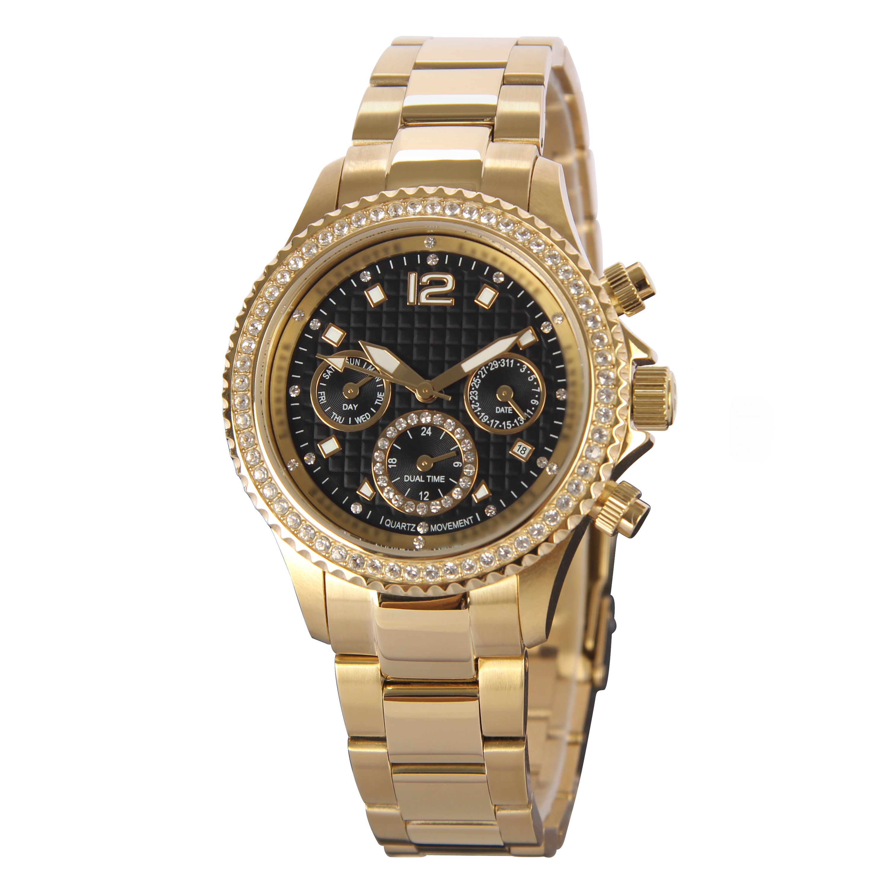 Dial: Textured black dial, gold indexes with luminous. 20 Swarovski crystals around sub-dial on 6 O'clock