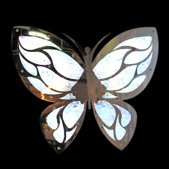 This is a lamp decorated with crystals and silver metals. The lamp is made into a butterfly with patterned wings. The lamp can be used as ceiling lamp or wall lamp.