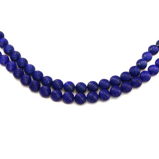 These is a string of beads made of blue coloured lapiz beads. The beads are decorated with s cut and are each of 20mm in diameter.