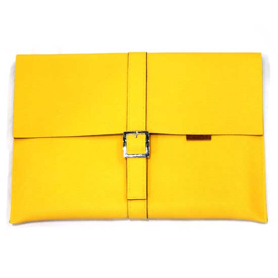 Featured here is a laptop case with a vibrant yellow tone. The plain-designed panel flaunts high simplicity. The strap-and-buckle closure is secure and details the case with a dash of elegance. The case suits young, trendy professionals.