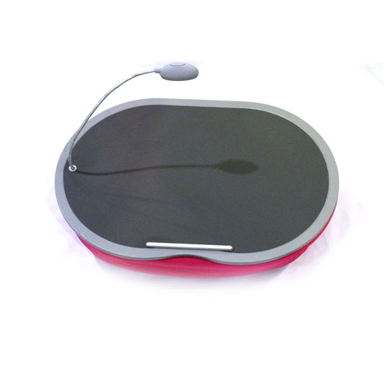 Pictured is a portable laptop desk with an LED lamp. The desk comes with a pure polyester exterior and a filling of polyurethane foam. This laptop desk is available in various fashionable colors to match your daily mood.
