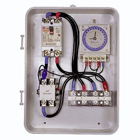 This large-scale time switch is a combination of the magnet-function and HTS-24B types. The sophisticated markers support fine adjustment for precise clock setting. The wall-mounted housing provides extended durability with complete protection.