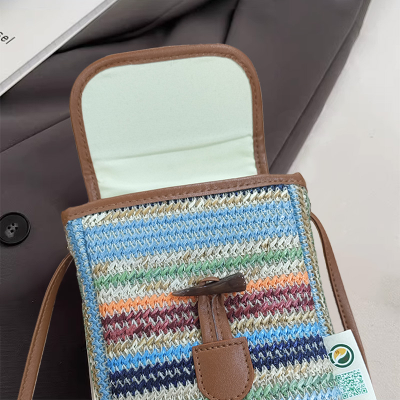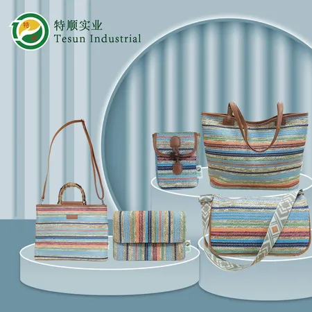 Large Striped Woven Tote Bag with Leather Handles Summer Beach Shoulder Bag