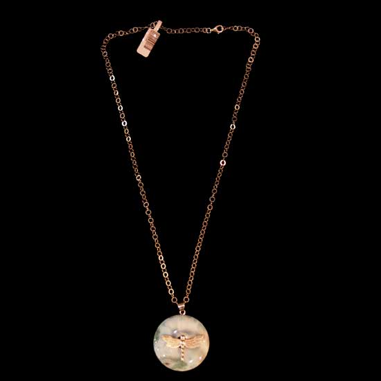 This beautiful necklace features a round larimar pendant adorned with a dragonfly. The charming stone comes with distinctive patterns colors that add detail to it. This simplistic, casual necklace complements your everyday dress beautifully.