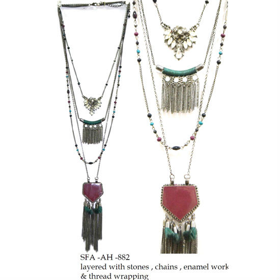 Layered chains Pendants with enamel work Thread wrapping & tassels