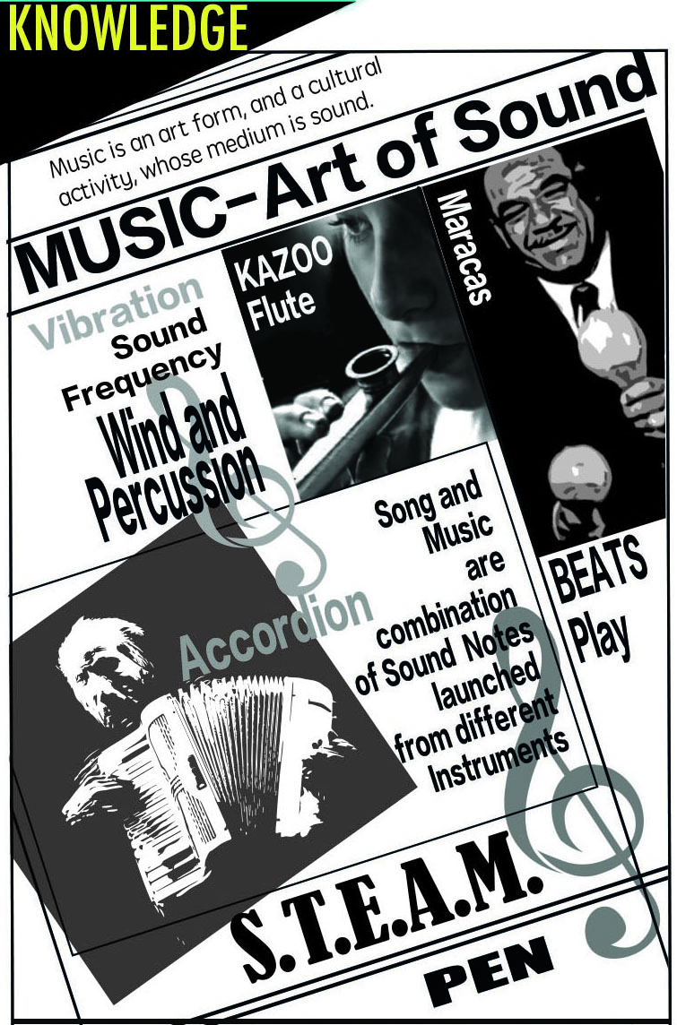 A Educational Gadget: Music is a Art Form, and a Cultural Activity, Whose medium is Sound. Learn the principle of how Sound occurs by Vibration with this Handy Instruments Pen. See how Wind and Percussion makes sound by vibrate the instrument to create music.