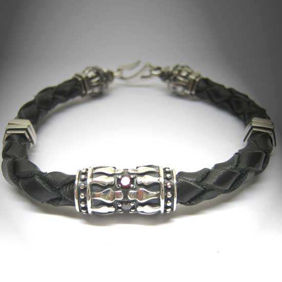 Featured here is a leather bracelet with a rock n’ roll design. The black leather highlights subtle diamond patterns for a touch of style. The bracelet is suitable for daily wear.