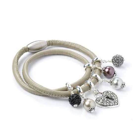 This cream-colored leather bracelet features shiny charms and a stainless steel lock. The well-designed bracelet comes with a stylish appearance. It is a great addition to your jewelry collection.