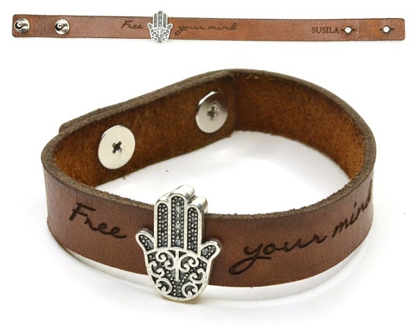 Bracelet of leather band with laser printed message, silver color charm and hitch clasp.