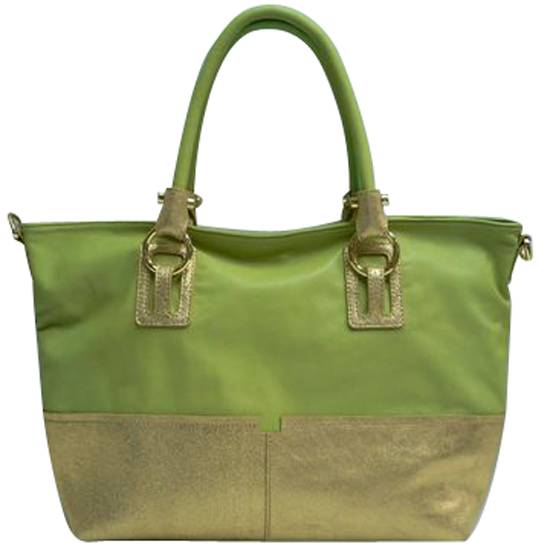 This is a fashion handbag made of real leather. The leather handbag is designed with stylish lime green and elegant dull golden appearance. The sophisticated handbag matches well with office wear, smart casual and dresses.