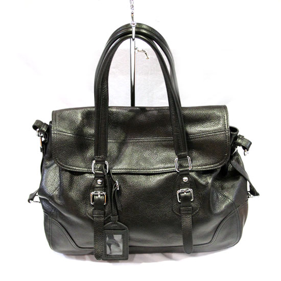 This chic ladies' handbag is made of textured black leather. It is adorned with silver-toned buckles and a hang tag for added appeal. The handbag is suitable for all types of casual occasions.