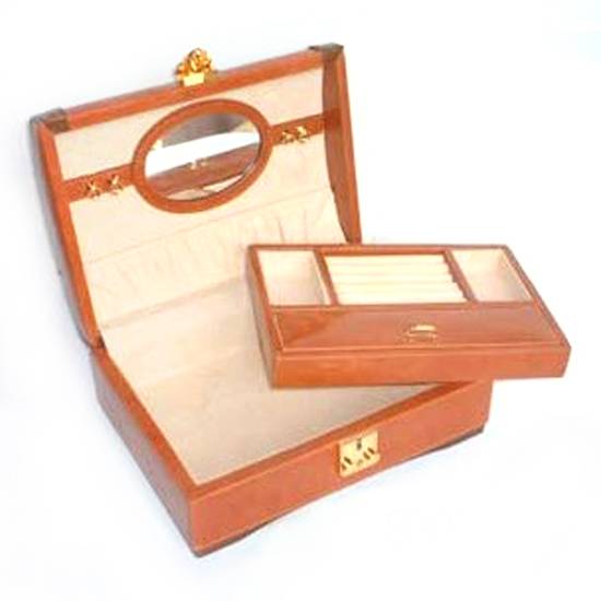 This browm leather jewellery box is designed with a golden lock. A large compartment on the bottom that is suitable for putting necklaces, bracelets or other large jewelleries. The movable upper compartment has small sub-compartments that are ideal for putting rings, ears rings and other small items.