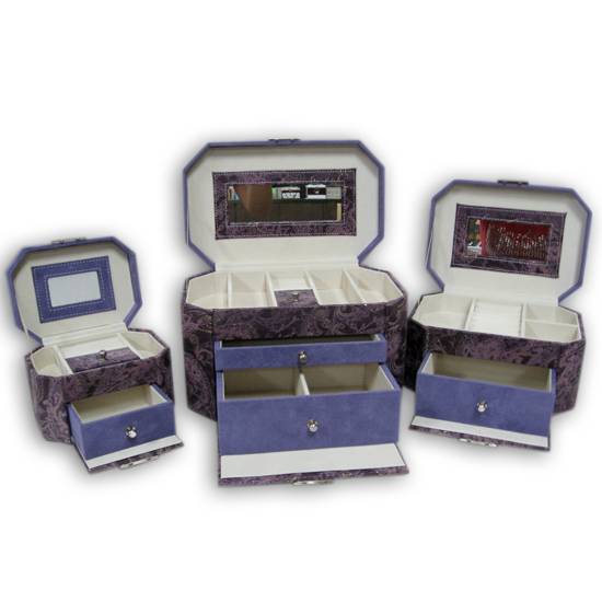 These are jewellery boxes or cases featured with purple marble patterns on the surface. Each of the three has different partitions and drawer for placing different numbers of jewellery items.