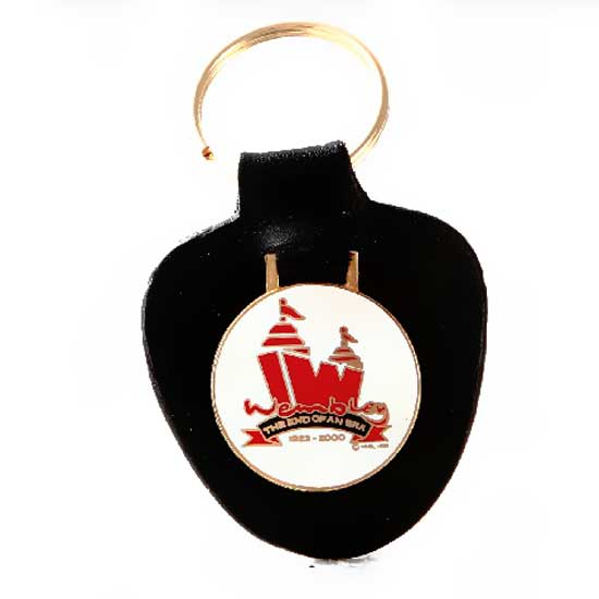 Displayed is a leather key ring with a leather plate in a unique shape. It is detailed with a white-and-red plate for a decorative style. This special leather key ring makes an ideal promotional item.
