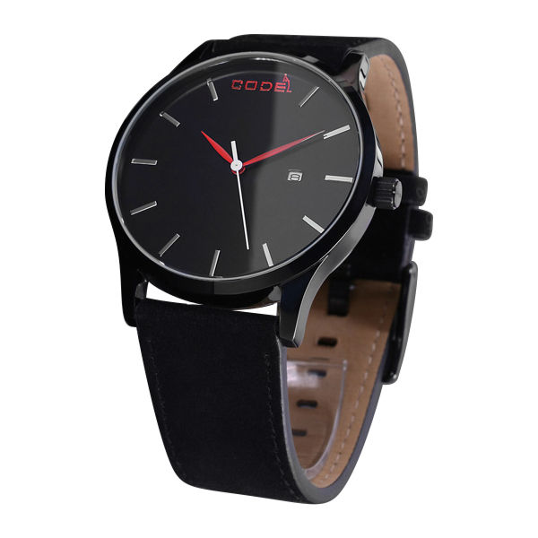 The minimalist outline of this leather watch delights in a sophisticated black and pledges a look on wrist that is refined yet versatile. The smooth stainless steel case envelopes a round dial with polished stick indexes, highlighting 3 slender hands of bold color finish for accurate analogue display.