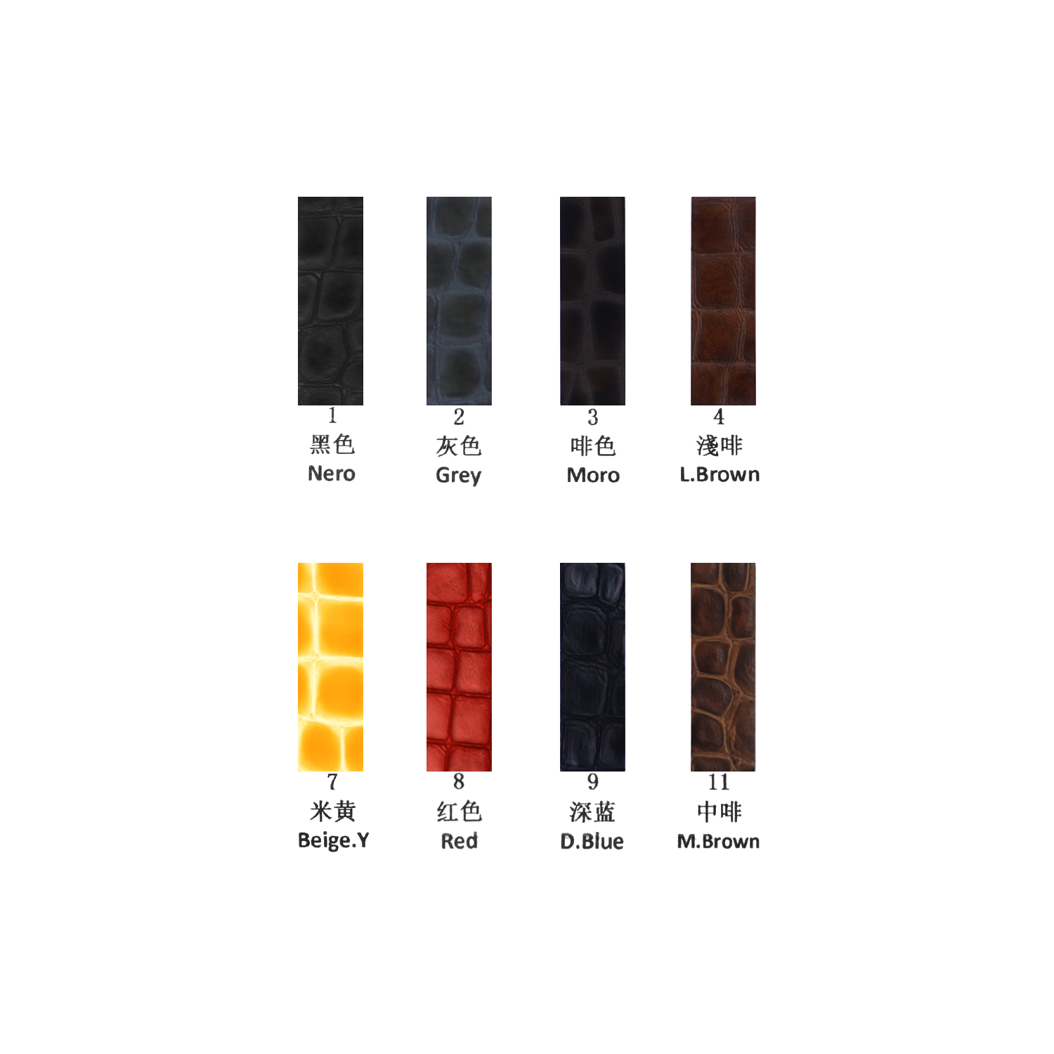 Nero, grey, moro, light brown, beige yellow, red, dark blue, middle brown