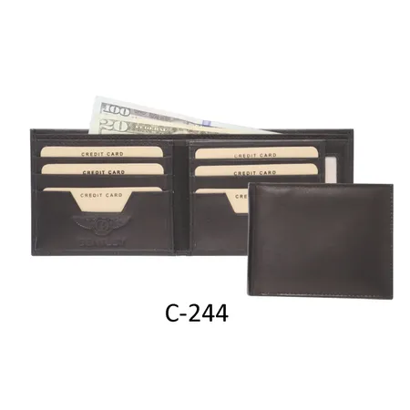 * Men's wallet with centre flap having 6 pockets for credit cards. * Two currency compartments. * Two window id and 2 additional hidden side pockets. * Customized logo embossing can be done. * Hard top-bottom box packing for each piece. Product Keywo