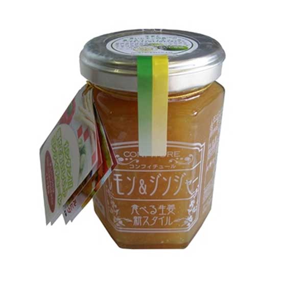 This lemon ginger confiture is made from Japanese lemons grown in the Iwagi area of Ehime Prefecture, and ginger grown in Kochi Prefecture. It is delicately made from only natural ingredients. The flavor of ginger has been combined with the subtle sour taste of the lemons, making it ideal as a topping for bread or yogurt.
