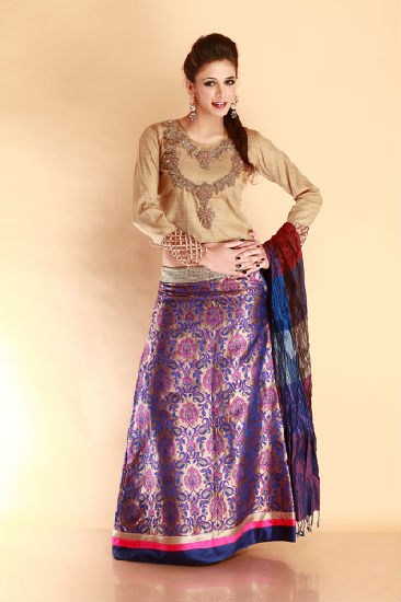 Royal blue Jamavar brocade Lengha skirt with sequined belt and antique Dabka embroidered top.