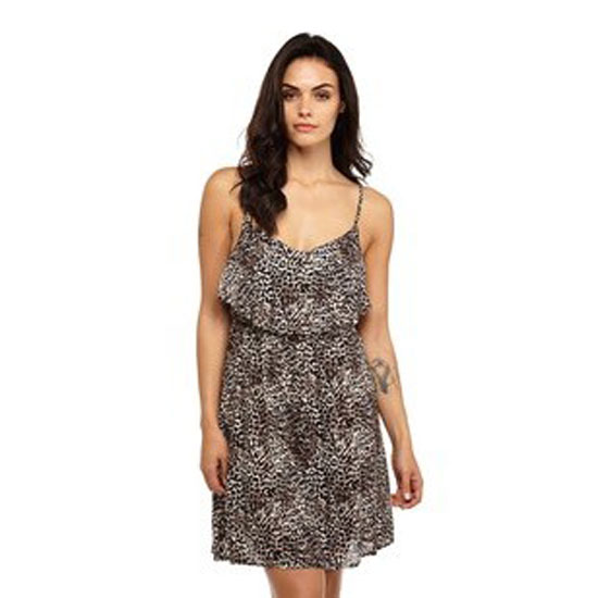This V-neck one-piece dress is printed with a leopard pattern. The tiered design adds a touch of playfulness to the dress. This dress goes perfectly with a pair of ballerina shoes.