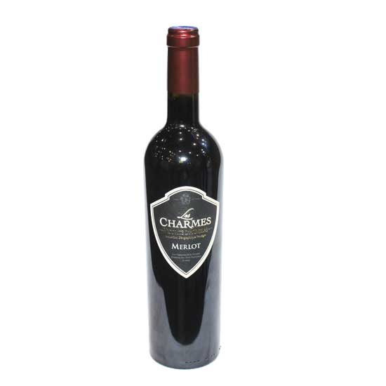 This is a bottle of Les Charmes Merlot that originates from France. With a vintage year of 2011, this red wine has a charming color and a fragrant nose. This high quality table wine is dry, making it perfect for meat dishes.