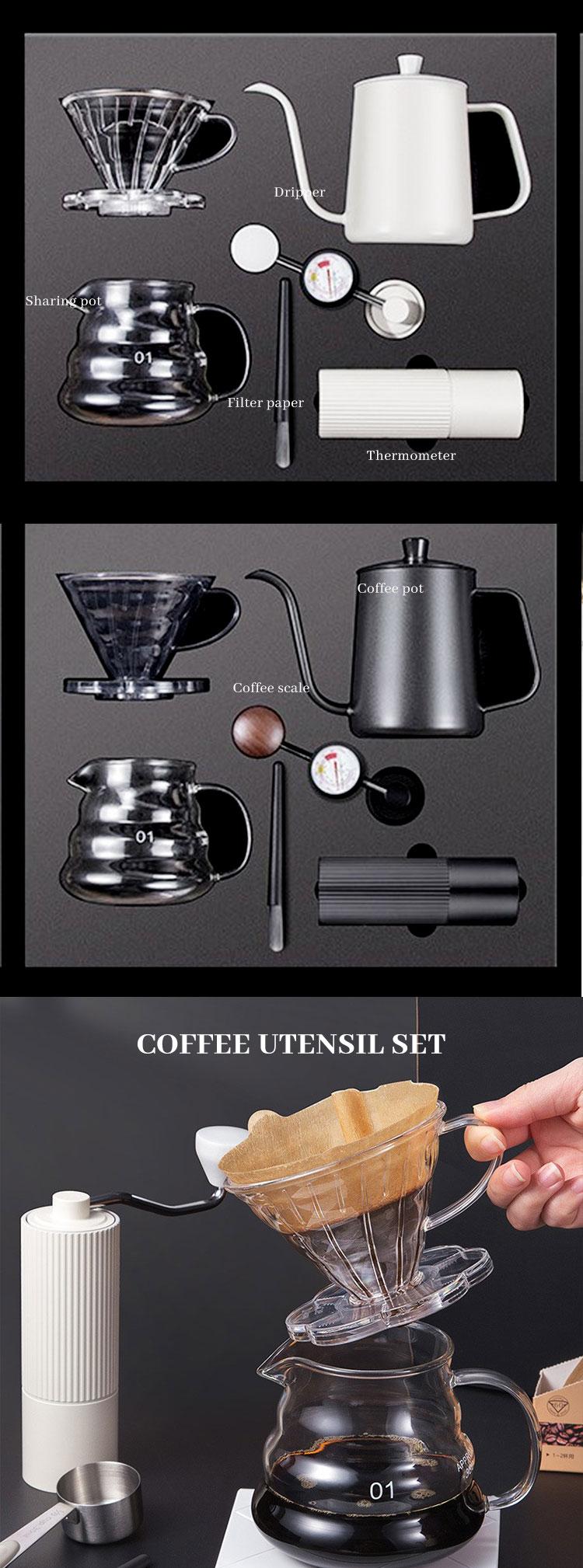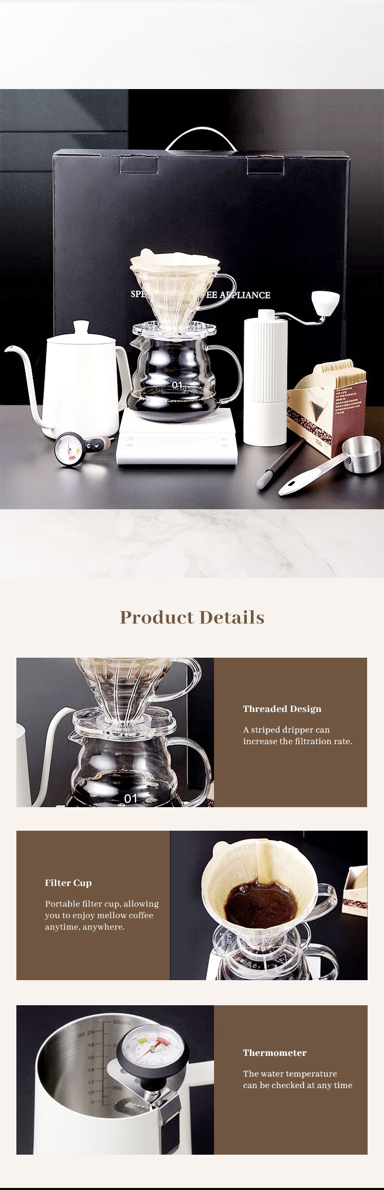 1. Filter cup 4. 600ML pour-over kettle 2. 300ML sharing pot 5. Coffee grinder 3. Cleaning brush 6. Thermometer