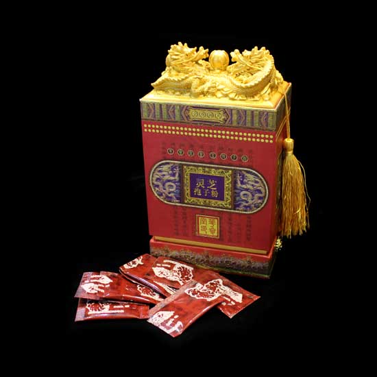 Displayed is a box of lingzhi spore powder that comes in many individual bags for your convenience. Made from carefully selected lingzhi spore, this product has multiple health benefits, including improving the immune system. This lingzhi spore powder is a healthy choice for you.