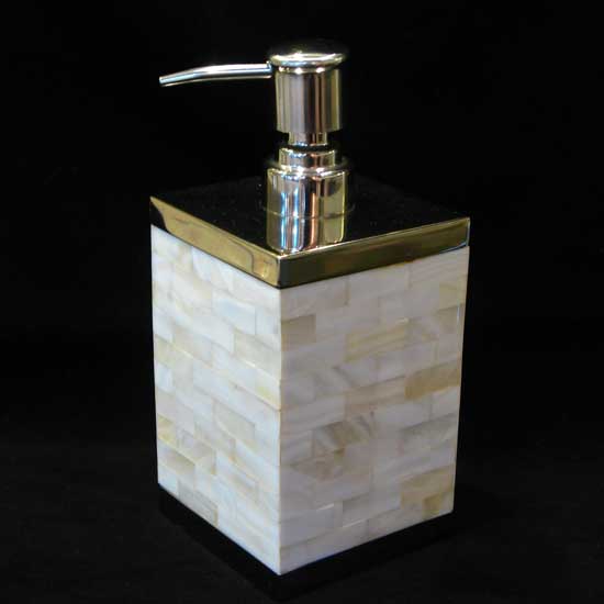 This liquid soap dispenser showcases a unique design. The prism-shaped body is made of exquisite nacre bricks. The cover is finely polished for added aesthetic value. Add this luxurious item to the bathroom.