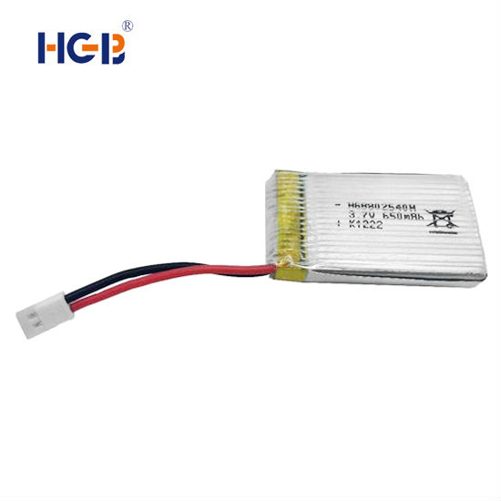 Displayed here is a lithium polymer battery for RC hobby use. It has a voltage of 3.7V and has a capacity of 650mAh. This battery comes in a compact rectangular design and has a pair of red and black cables for connection. It flaunts a long working life and is a reliable power source.